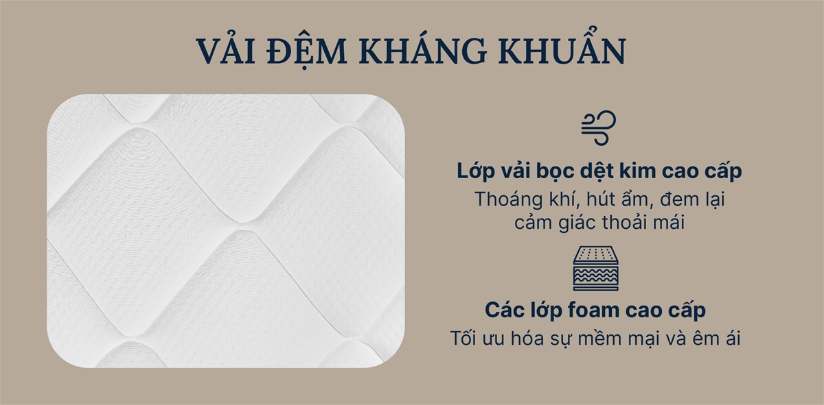 Sử dụng các lớp foam cấu trúc mở thoáng khí, nâng đỡ theo đường cong cơ thể, êm ái, thoáng mát khi nằm. Chất lượng foam được kiểm chứng theo dây chuyền sản xuất công nghệ Nhật.